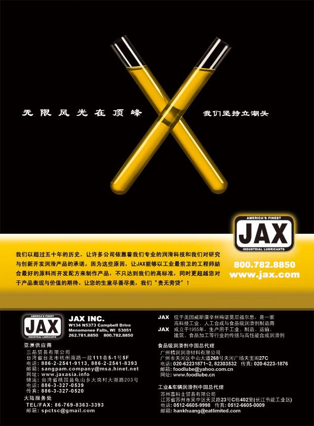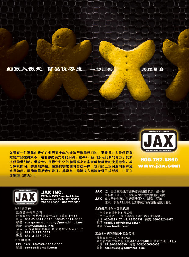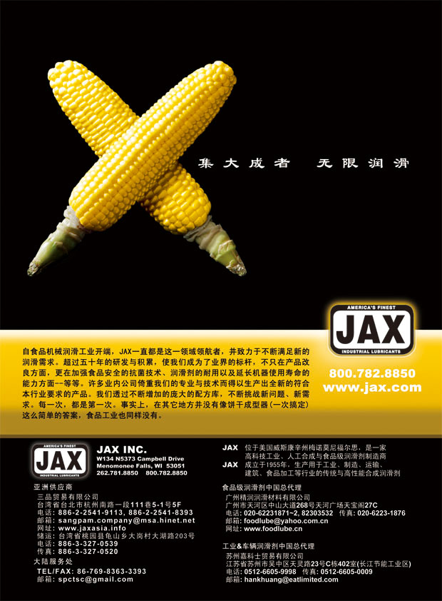JAX 品牌廣告將於大陸油品知名雜誌國際食品加工及包裝商情 (China Food Manufacturing Journal) 中刊載,刊載月份為2010年9月~12月及2011年1月、3月、5月。 |